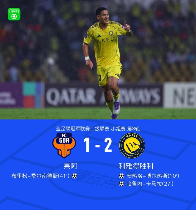 北京时间10月22日,亚冠联赛第二级别小组赛第三轮打响,果阿队对阵利雅得队。上半场,安杰洛·博尔赫斯远射取得领先。卡马拉在对方包夹下冷静得分,扩大领先优势。布里森-费尔南德斯小角度破门扳回一球。下半场双方都没能改变比分,最后时刻帝汶染红。最终,利雅得客场2-1击败果阿,小组赛3连胜领先。主赛事第10分钟,博尔赫斯远射破门,利雅得1-0果阿获胜。第27分钟,卡马拉在对手包夹下冷静破门,利雅得2-0果阿获胜。第42分钟,布里森左路小角度破门,果阿1-2利雅得。第90+3分钟,帝汶怒踢球表达不满,裁判向他出示红牌并罚下场。球员们的精彩时刻n 双方就位,比赛即将开始。第5分钟,叶海亚跟进小角度射门,皮球偏出远门柱。第10分钟,博尔赫斯远射破门。利雅得1-0果阿获胜。第24分钟,马兰起跳头球稍稍偏出。第27分钟,卡马拉在对方包夹下冷静破门。利雅得2-0果阿获胜。第37分钟,颇具威胁!第42分钟,韦斯利·特谢拉的远射稍稍偏出。布里森左路小角度破门。果阿在利雅得以 1-2 获胜。第45、3分钟,阿尔尝试哈桑远射,皮球被门将扑出。第64分钟,利雅德换人。菲利克斯作为替补登场。第66分钟,果阿唯一一次机会被扑出。边裁在第82分钟下场。机会没有抓住!加内姆的头球攻门超出了底线。第90分钟和第3分钟,帝汶愤怒地踢球表达不满。裁判员埃里出示红牌并将他罚下场。比赛报告详细信息已更新...球队阵容技术统计